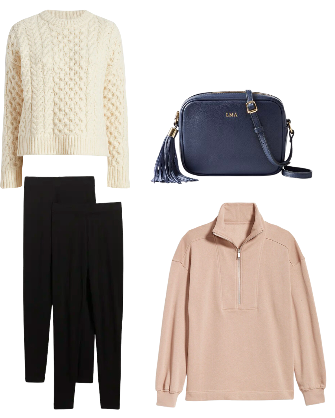 Fisherman Sweater // Quarter Zip // Crossbody Bag // Fleece Leggings //